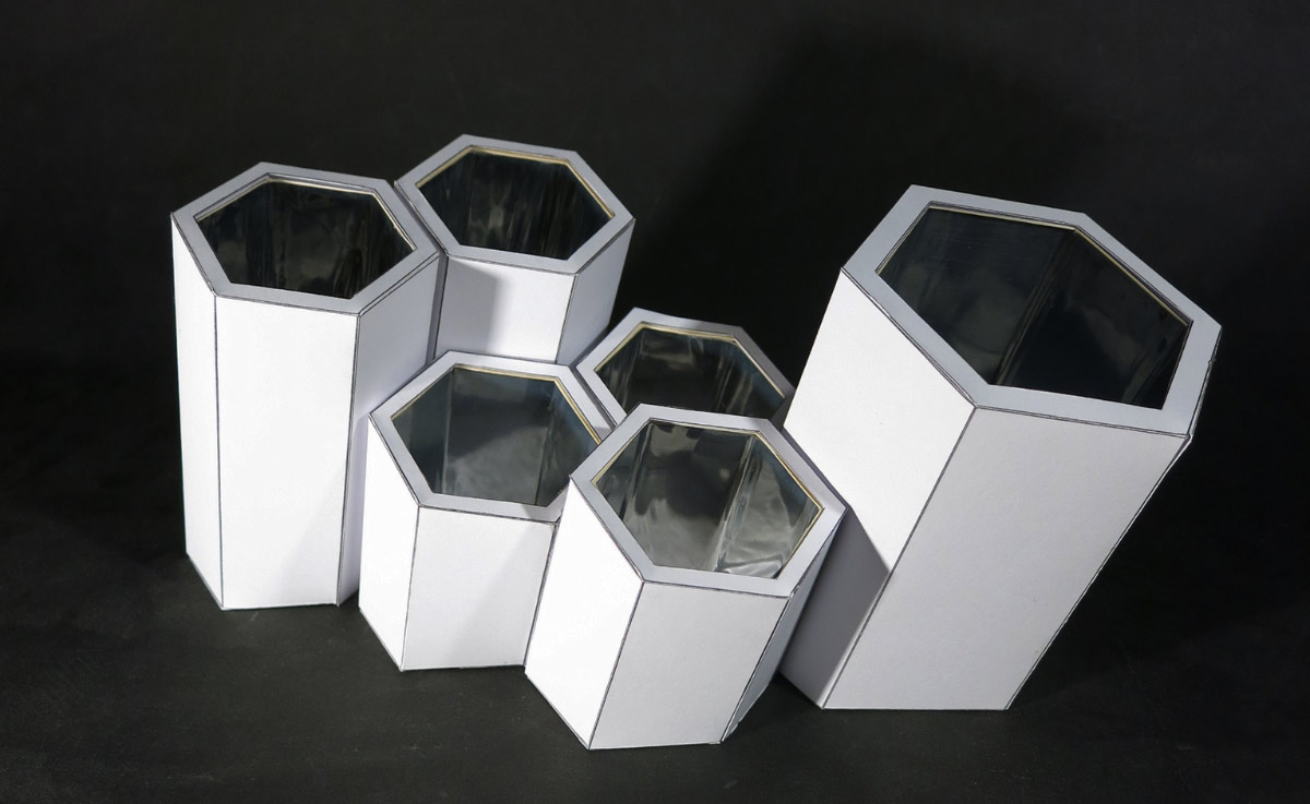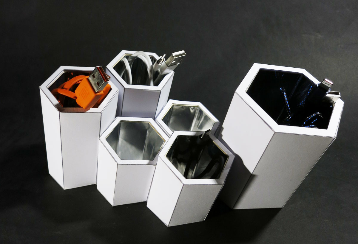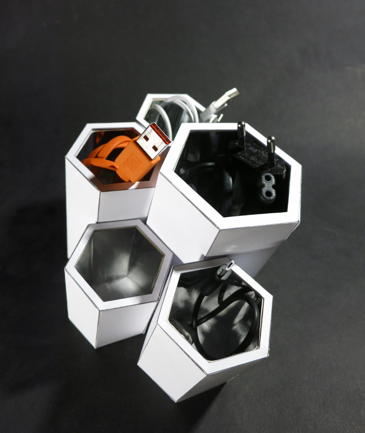 Edgar is your personal butler which supports organizing all your cables. The modular system sorts and stores all different kinds of currently unused cables in your household. To use the available space effectively the basic shape is a hexagon. There are differently sized hexagons to store all kinds of varying cables. The innards of the hexagons are equipped with a mirror which multiplies the cable structure and creates an abstraction. This gives you the possibility to use Edgar in two ways. On the one hand you can hide it and your cables in your drawer. On the other hand you have the possibility to exhibit your wires.